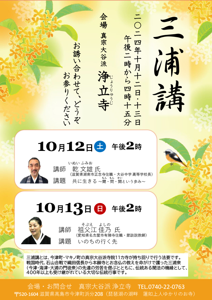 2024年10月12日・13日 三浦講 三浦講とは、今津町・マキノ町の真宗大谷派寺院11カ寺が持ち回りで行う法要です。戦国時代、石山合戦で織田信長から本願寺とお念仏の教えを命がけで護った三浦衆(今津・海津・大浦の門徒衆)の先達の労苦を偲ぶとともに、伝統ある聞法の機縁として、400年以上も受け継がれている大切な伝統行事です。 案内チラシのダウンロードはこちらから(PDFファイル)